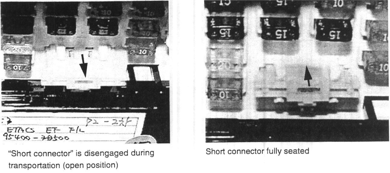The yellow "short connector" is located in the passenger compartment fuse panel and needs to be fully seated to enable the circuits to operate.