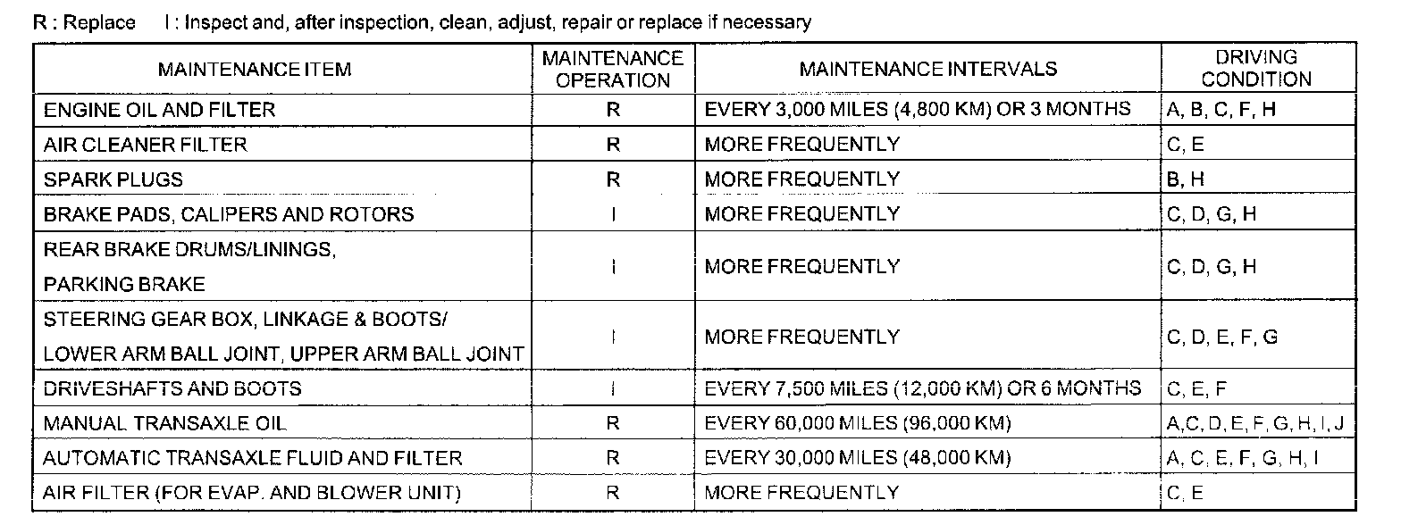 The following items must be serviced more frequently on cars normally used under severe driving conditions. Refer to the chart below for the appropriate maintenance intervals.