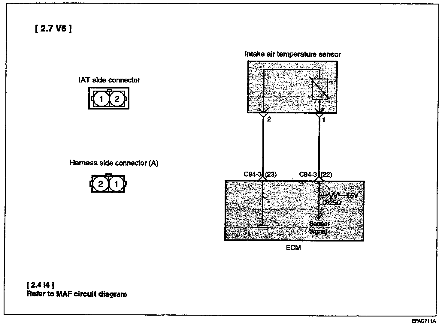 INTAKE AIR TEMPERATURE (IAT) SENSORThe intake air temperature sensor (IAT Sensor), located in the intake air hose, is a thermistor sensor for detecting the intake air temperature. According to the intake air temperature information from the sensor, the ECM provides necessary fuel injection amount control.