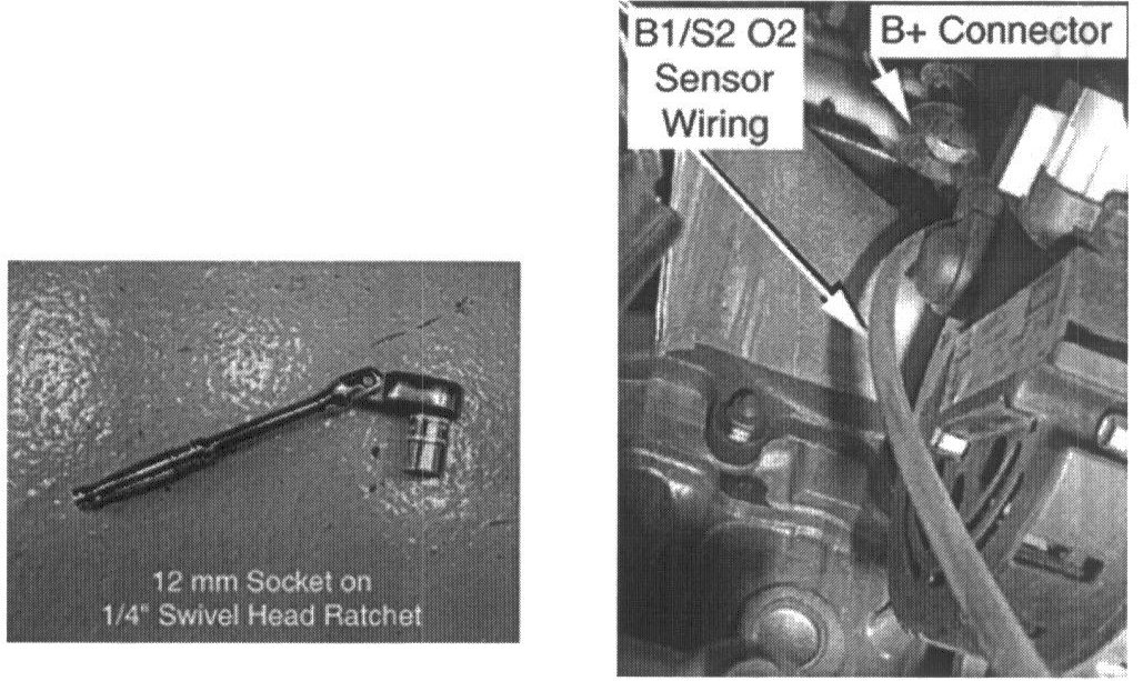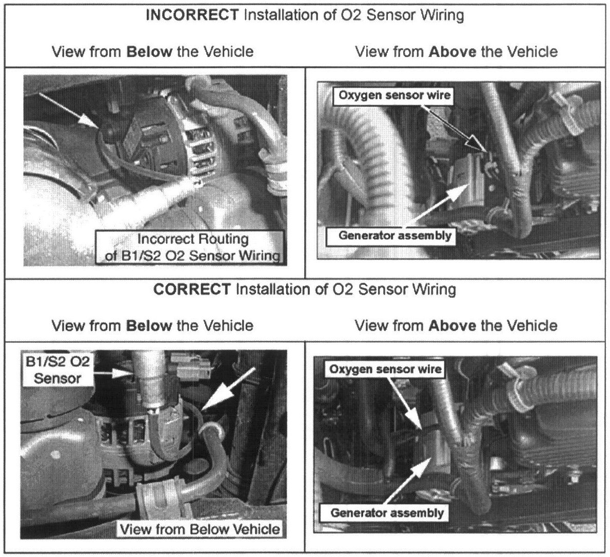 B. If the vehicle is equipped with ABS, the B1/S2 02 Sensor Wiring routing is not visible from the top. Lift the vehicle and examine the 02 Sensor wiring from below the vehicle. The pictures show the correct and incorrect wiring routing when viewed from below the vehicle.