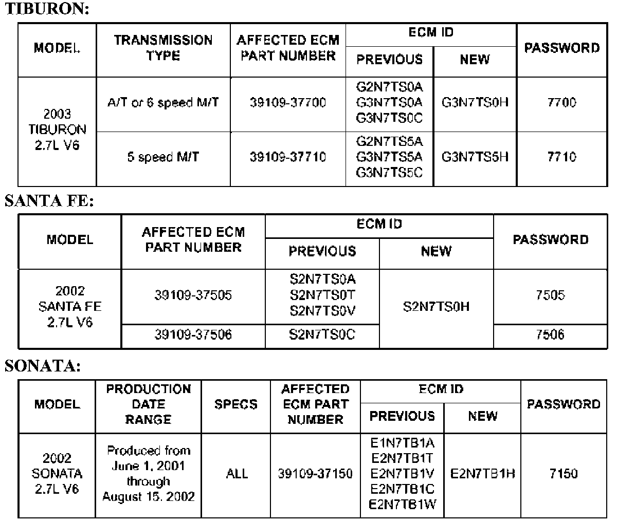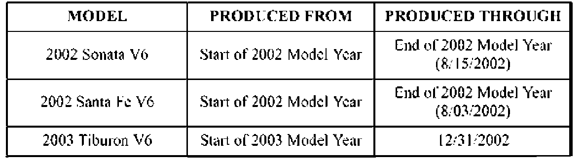 Some 2002 MY Sonata and Santa Fe and 2003 MY Tiburon vehicles equipped with 2~7L V6 engines and Titanium 02 Sensors may experience the following conditions: