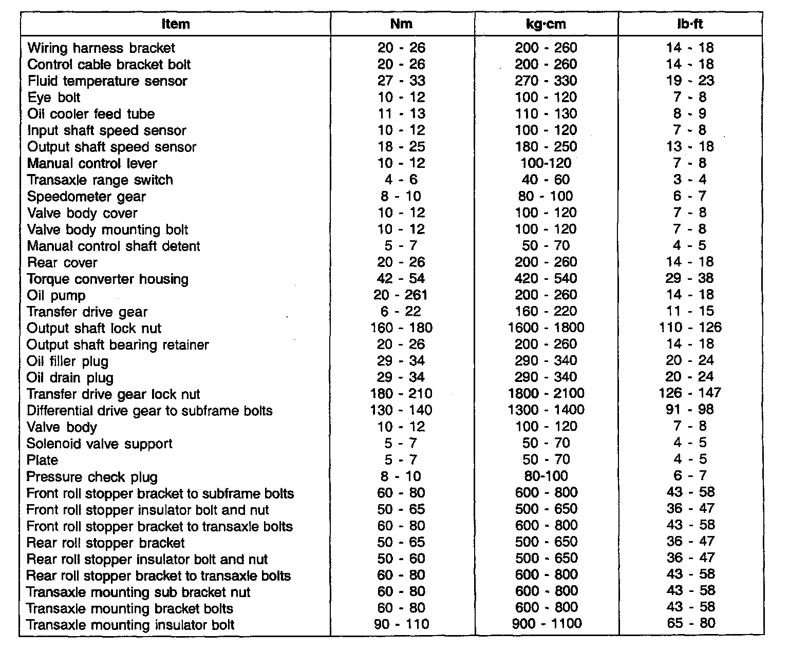 Front Roll Stopper Bracket To Transaxle Bolts 60 - 80 Nm (43 - 58 ft. lbs.)