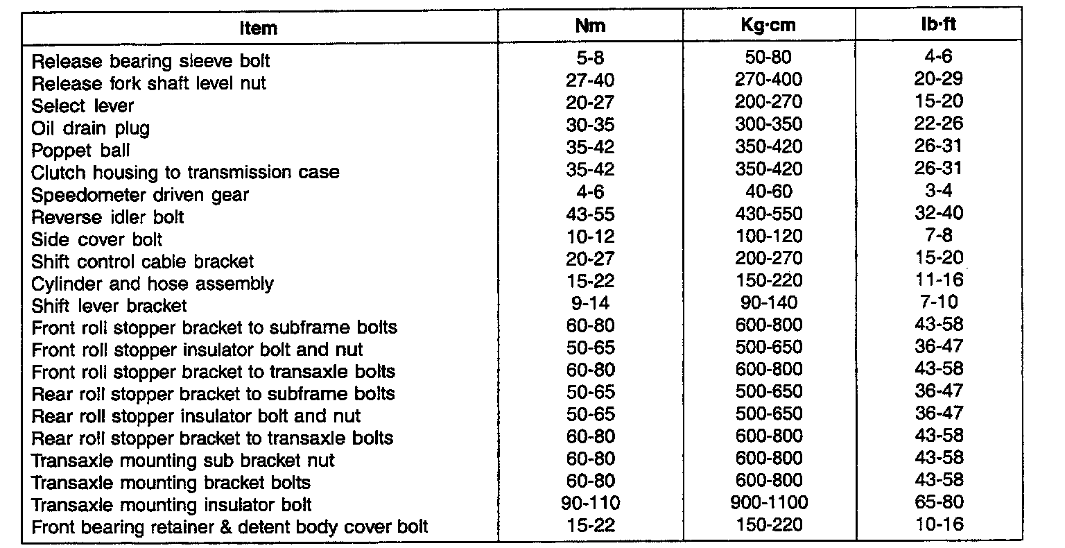 Front Roll Stopper Bracket To Transaxle Bolts 60 - 80 Nm (43 - 58 ft. lbs.)