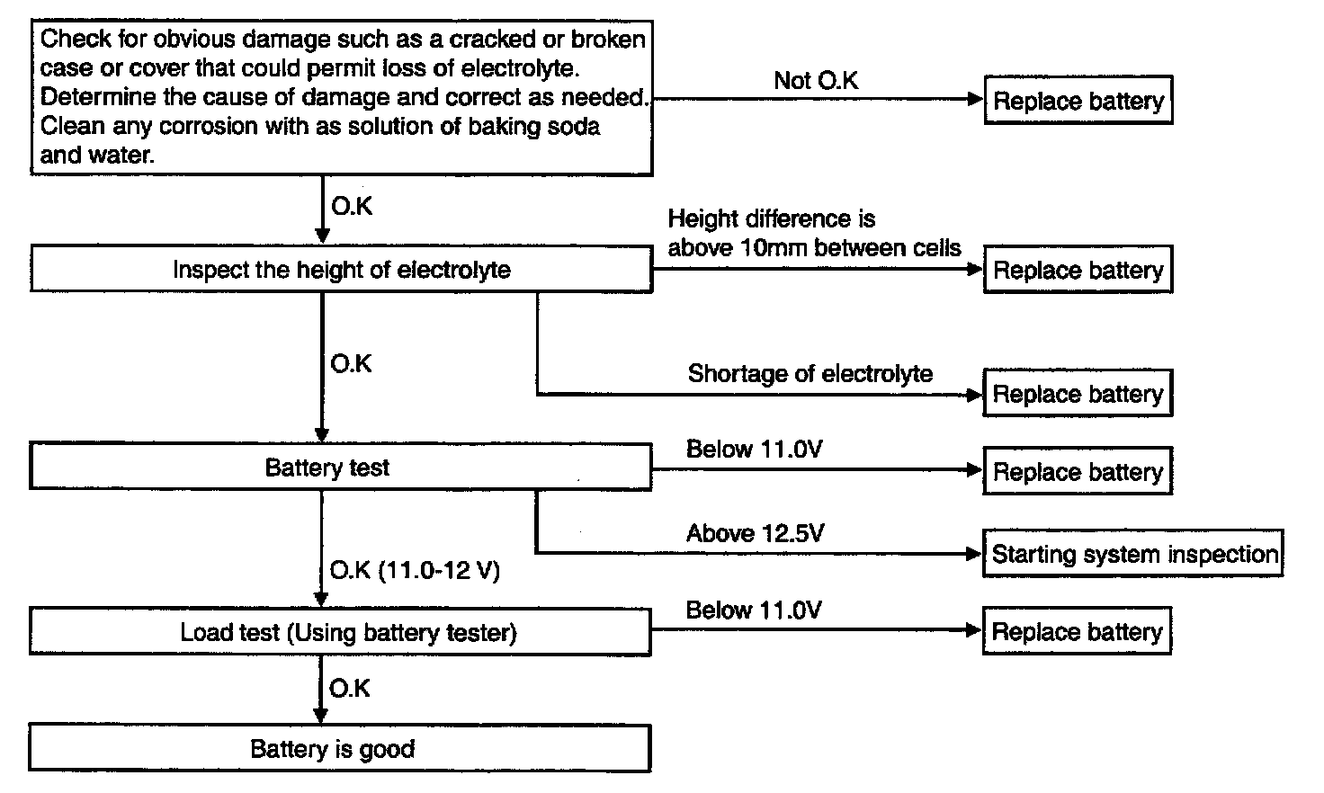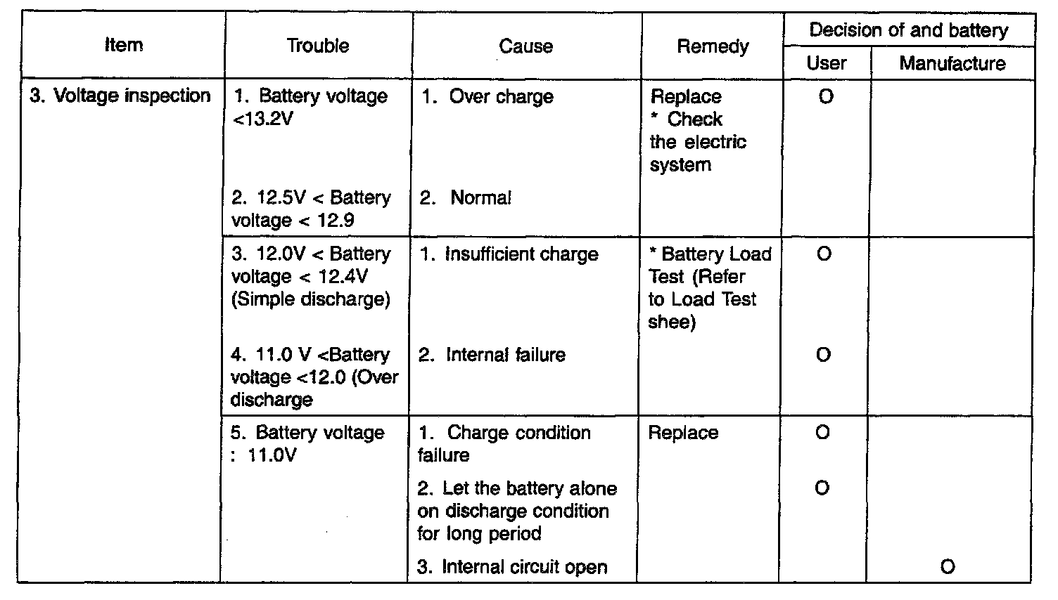 3. If the battery voltage (left alone within 2 hours after recharging) is over 12.5 V and the voltage after load test is over the standard value, this battery can be used.