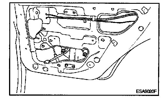 9. Remove the door regulator channel mounting bolts and then remove the door regulator assembly.
