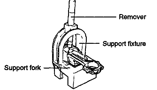 4. To remove the pin from the piston, place the piston in the support fixture with the rod resting on the fork inserts. Pass the remove tool through the top of the support fixture and use it to press out the pin.