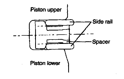 2. Install the upper side rail. To install the side rail, first put one end of the side rail between the piston ring groove and spacer, hold it firmly, and press down with a finger on the portion to be inserted into the groove (as illustrated).