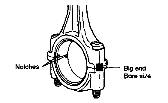 1. When the connecting rod cap is installed, make sure that the cylinder numbers match. (marked on rod end cap at disassembly) When a new connecting rod is installed, make sure that the notches holding the bearing in place are on the same side.