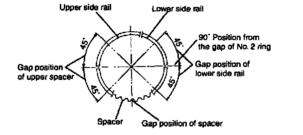 7. Position each piston ring end gap as far away from its neighboring gaps as possible. Make sure that the gaps are not positioned in the thrust and pin directions.