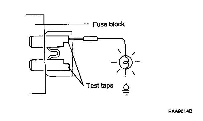 A blade type fuse has test taps provided to allow checking the fuse itself without removing it from the fuse block. The fuse is good if the test lamp lights up when one lead is connected to the test taps (one at a time) and the other lead is grounded. (Turn the ignition switch so that the fuse circuit becomes operative.)
