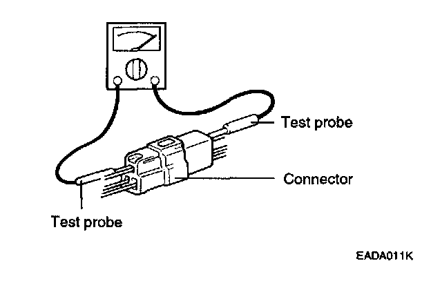 11. When using a circuit tester to check continuity or voltage on connector terminals, insert the test probe into the harness side. If the connector is a sealed connector, insert the test probe through the hole in the rubber cap until it contacts the terminal, being careful not to damage the insulation of the wires.