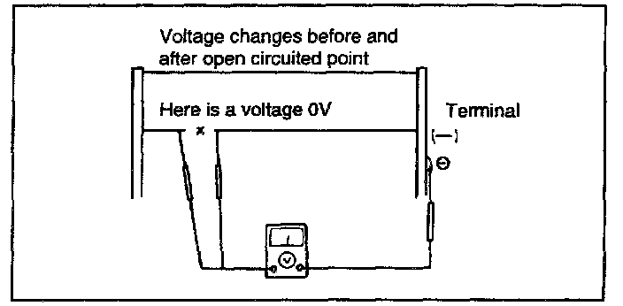 4. To check for open circuits, slowly move the test lead in the direction that the open circuit seems to exist. Try to find a point where a voltage is generated or changes to 0 V The point where the voltage has changed is the open-circuit point.
