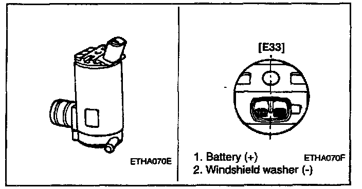 Connect positive (+) and negative (-) battery cables to terminals 1 and 2 respectively to see that the washer motor runs and water sprays from the nozzles.