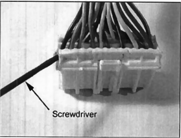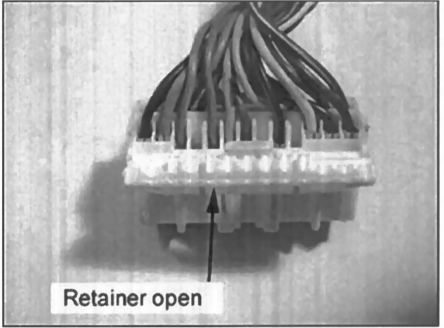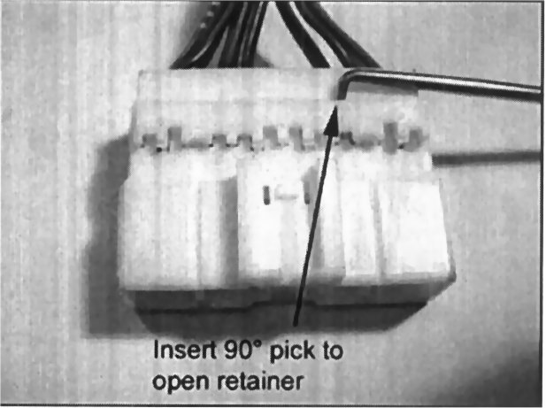 12. Using a 90° pick or similar tool, insert the pick into the connector retainer as shown and pull the retainer open approximately 1/8 inch.