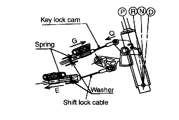 1. Move A/T lever to "P" position to set the key lock cam and the shift lock cam as shown in the figure.