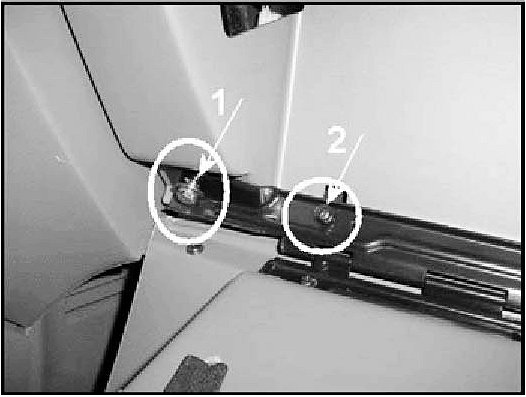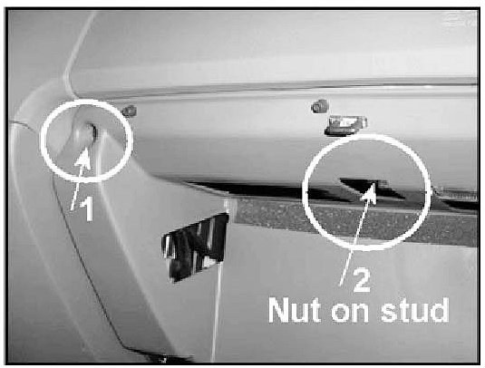 B. Remove the nut (2) on the stud behind the glove box latch.