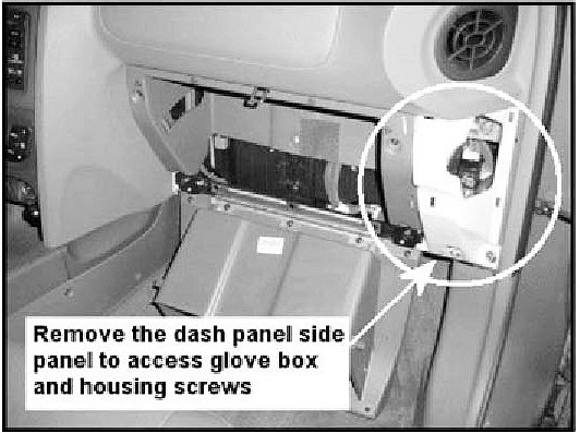 Remove the cover on the right side of the glove box. This will provide access to the mounting screws of the glove box and housing.