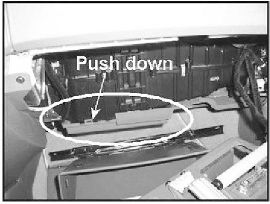 2. Remove the glove box damper by gently pulling the mounting pin out, then feed the mounting pin through the hole. Hold/support the glove box to prevent it from swinging wide open when the damper is removed. Lower the glove box.