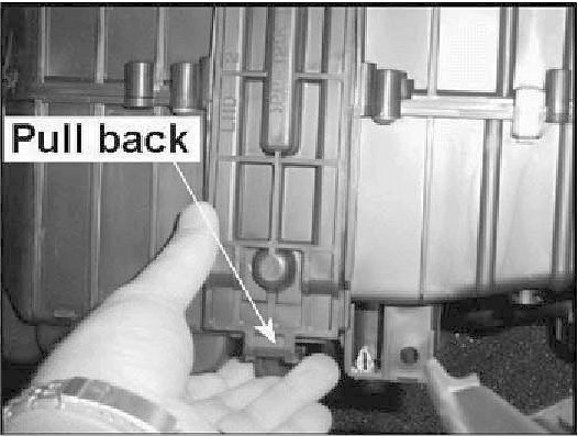 9. Use your finger to pull the lock tab down and toward you to remove the filter access door.