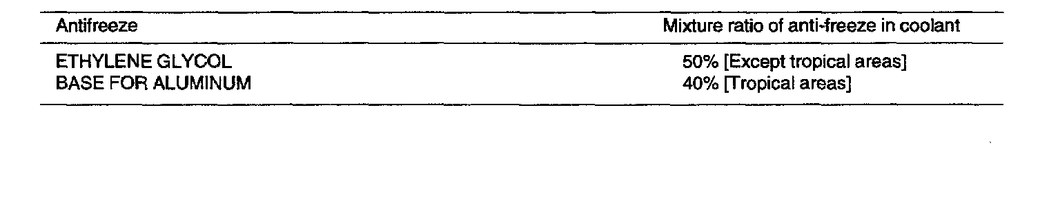 CAUTION: If the concentration of the coolant is below 30%, the anti-corrosion property will be adversely affected. In addition, if the concentration is above 60%, both the anti-freeze and engine cooling properties will decrease, affecting the engine adversely. For these reasons, be sure to maintain the concentration level within the specified range. Do not use together with another brands product.