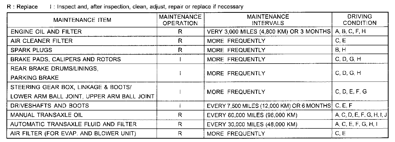 The following items must be serviced more frequently on cars normally used under severe driving conditions. Refer to the chart below for the appropriate maintenance intervals.