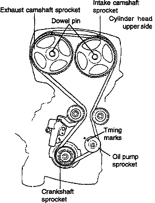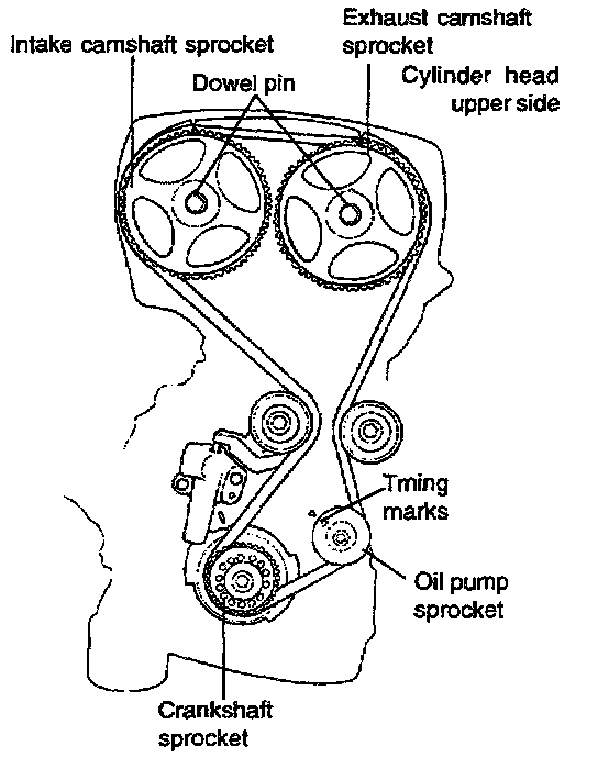 At this time the timing marks of the camshaft sprocket and the upper surface of the rocker cover should coincide, and the dowel pin of the camshaft sprocket should be at the upper side.