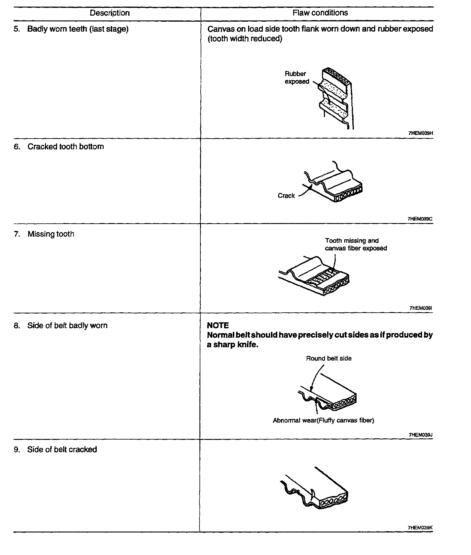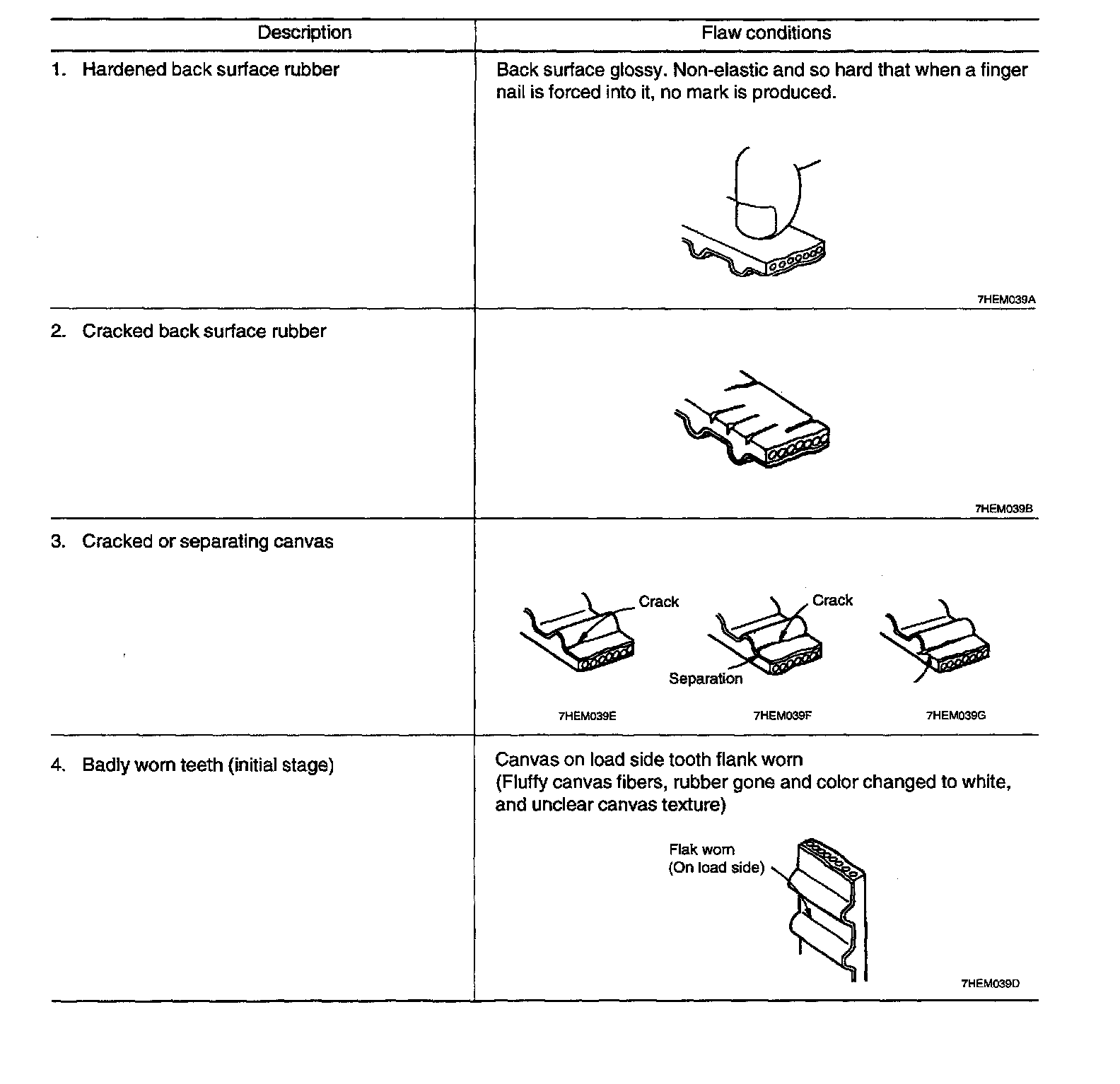 2. When the engine is overhauled or belt tension adjusted, check the belt in detail. If the following flaws are evident, replace the belt with a new one.
