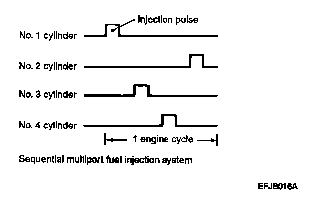 The injector drive times and injector timing are controlled so that the optimum air/fuel mixture is supplied to the engine to correspond to the continually-changing engine operation conditions. A single injector is mounted at the intake port of each cylinder. Fuel is sent under pressure from the fuel tank by the fuel pump with the pressure being regulated by the fuel pressure regulator. The fuel thus regulated is distributed to each of the injectors. This is called multiport. Fuel injection is normally carried out once for each cylinder for every two rotations of the crankshaft. The PCM provides a richer air/fuel mixture by carrying out "open-loop" control when the engine is cold or operating under high load conditions in order to maintain engine performance. In addition, when the engine is warm or operating under normal conditions, the PCM controls the air/fuel mixture by using the heated oxygen sensor signal to carry out "closed-loop" control in order to obtain the theoretical air/fuel mixture ratio that provides the maximum cleaning performance from the three way catalyst.