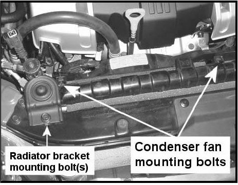 3. Remove the two condenser fan shroud mounting bolts, and the 2 radiator mounting bracket bolts (one radiator bolt is not shown in the picture). Remove the brackets, but do not remove the radiator.