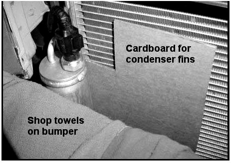 6. Protect the paint on the bumper in front of the receiver drier assembly with shop towels (or equivalent). Also slide the cardboard protector behind the receiver drier to prevent damage to the condenser fins.