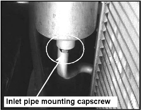 10. Remove the receiver drier inlet pipe mounting capscrew from the bottom of the receiver drier.