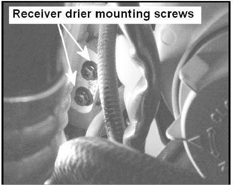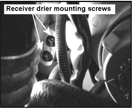 12. Remove the 2 receiver drier mounting capscrews from the engine side of the condenser and remove the receiver drier from the vehicle.
