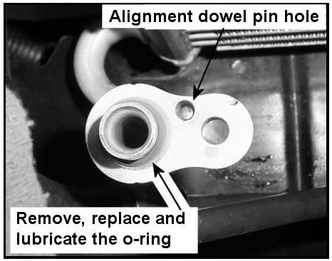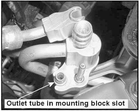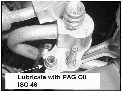 19. Lubricate the 8 mm diameter 0-ring (P/N 97690-34310) on the outlet tube with PAG oil.