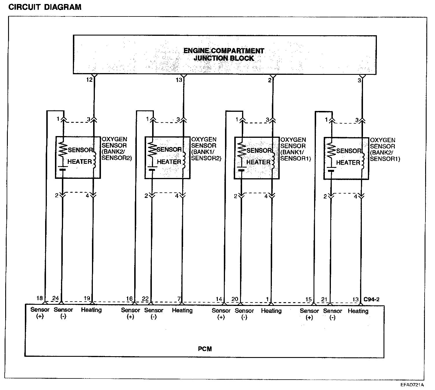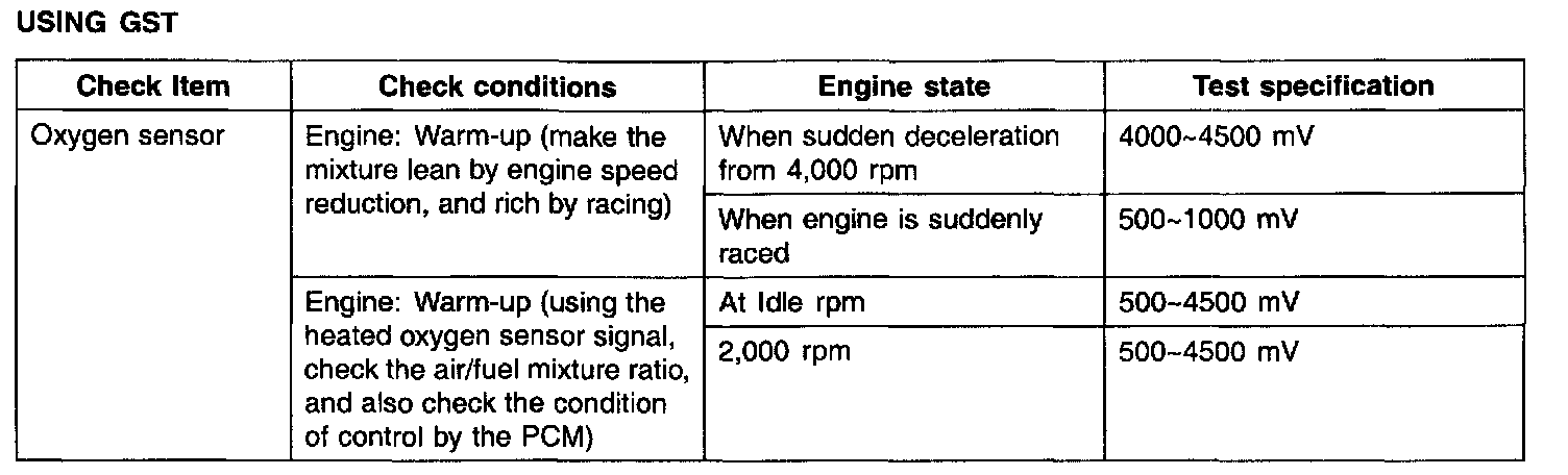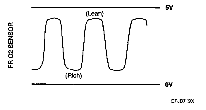 HEATED OXYGEN SENSOR (HO2S)The heated oxygen sensor senses the oxygen concentration in exhaust gas and converts it into a voltage which is sent to the PCM. The oxygen sensor outputs about 0 V when the air fuel ratio is richer than the theoretical ratio, and outputs about 5 V when the ratio is more lean (higher oxygen concentration in exhaust gas.). The PCM controls the fuel injection ratio based on this signal so that the air fuel ratio is maintained at the stoichiometric ratio. The oxygen sensor has a heating element which ensures sensor performance during all driving conditions.