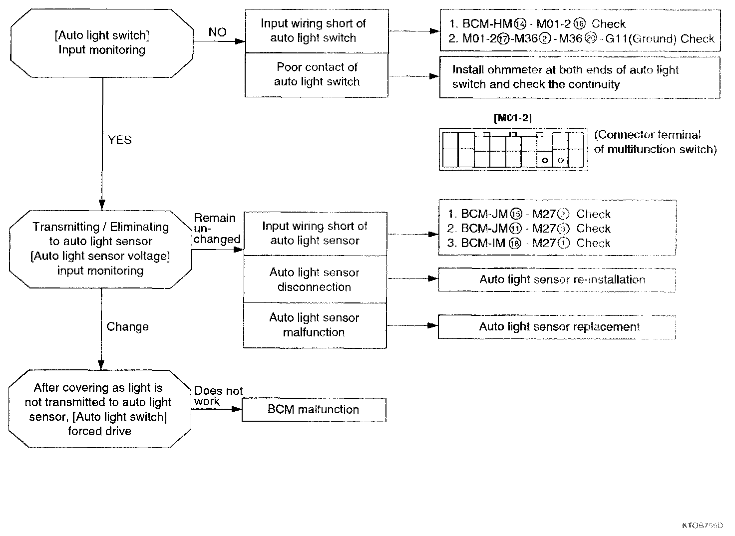 NOTE: When the ambient luminous intensity is dark, tail lamp and headlamp may turn on simultaneously in auto light on condition In this case it's not the failure.