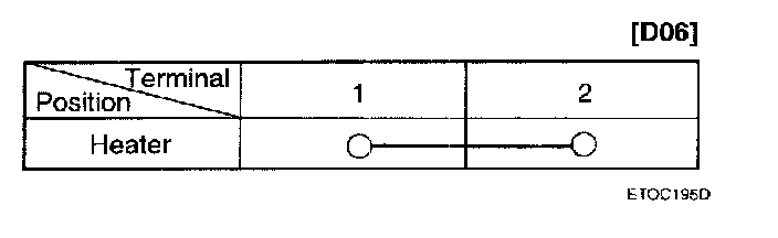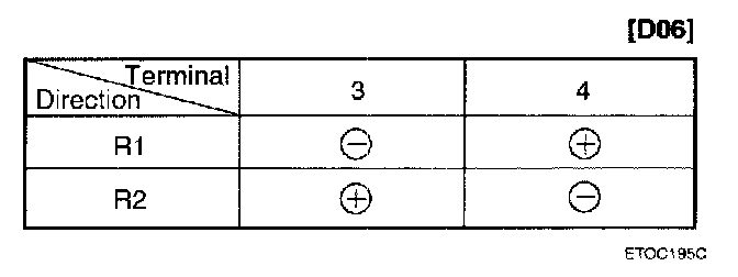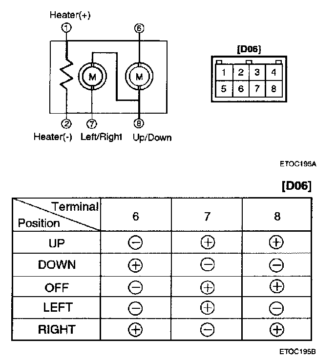 Apply battery voltage to each terminal as shown in the table and verify that the mirror operates properly.