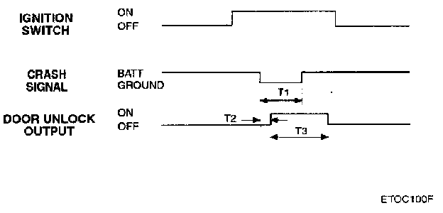 If IG1 is on and a crash signal is received, send an unlock pulse to the door locks. Unlock signal must occur within 12.5 msec after crash signal is received. Unlock pulse is 5 sec period. If crash unlock is not used in a particular variant then the crash input is to be left floating.