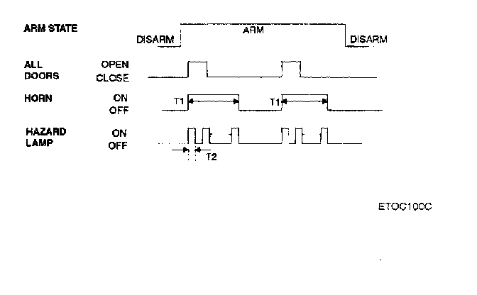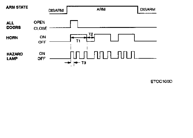 This system enters the armed state if it is in the pro- armed state and, after 0.6 sec, check actuator lock and each door, hood and tail gate close, and no door warning switch (no key in ignition).