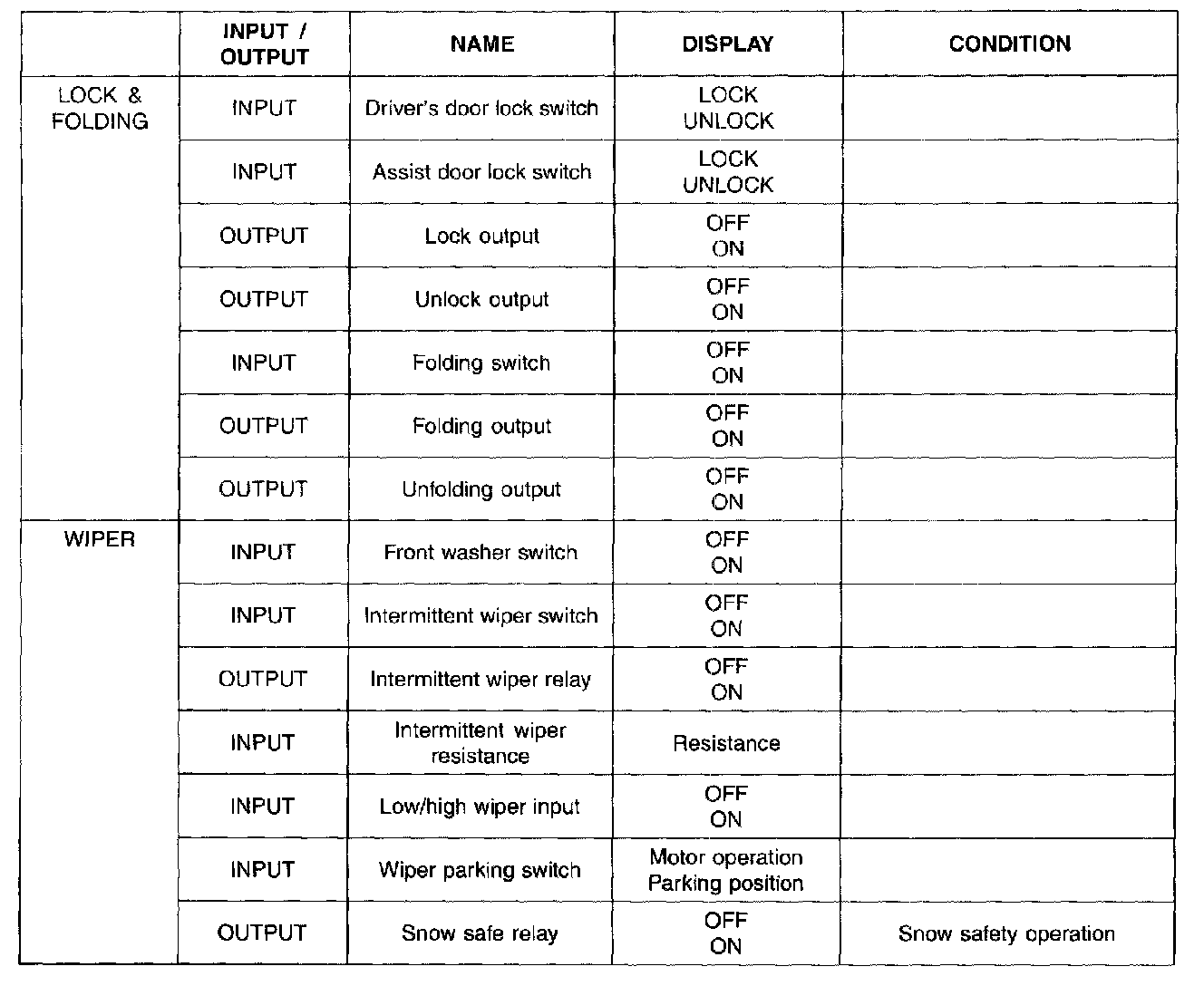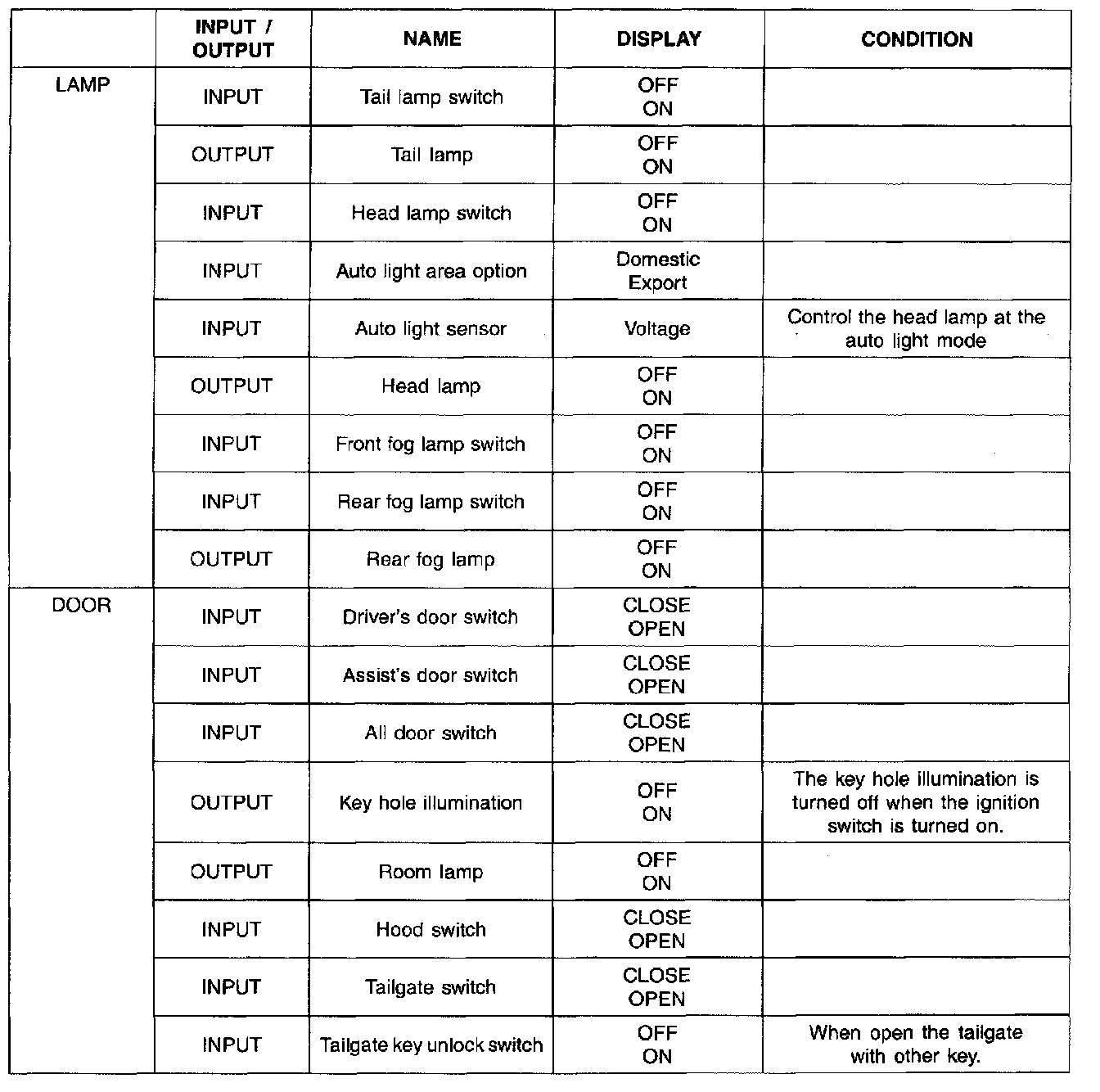 The components which is on and off as like turn signal lamp, seat belt indicator, burglar alarm horn, chime bell and front wiper relay are displayed "ON" while controlling.