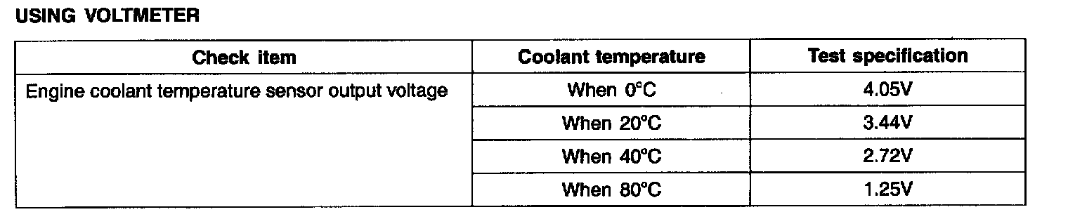 The engine coolant temperature sensor installed in the engine coolant passage of the cylinder head detects the engine coolant temperature and emits signals to the ECM. This part employs a thermistor which is sensitive to changes in temperature. The electric resistance of the thermistor decreases in response to a temperature rise. The ECM determines engine coolant temperature by the sensor output voltage and provides optimum fuel enrichment when the engine is cold.