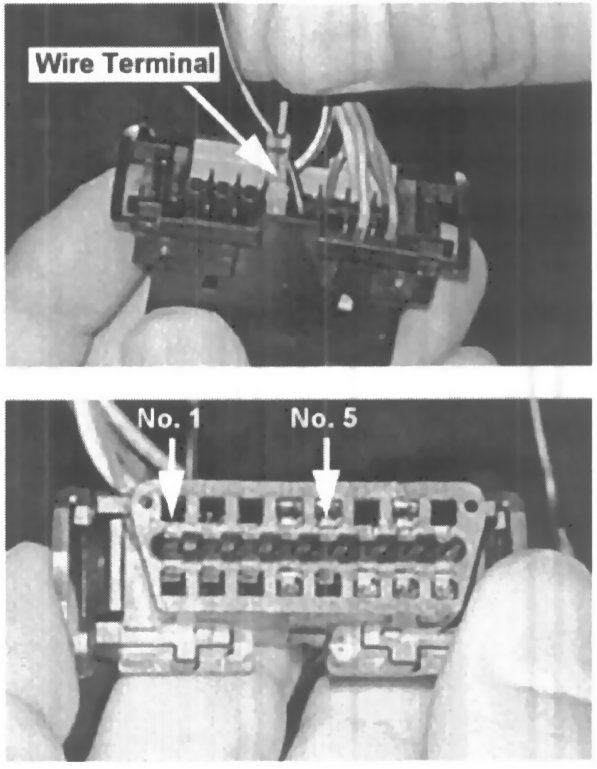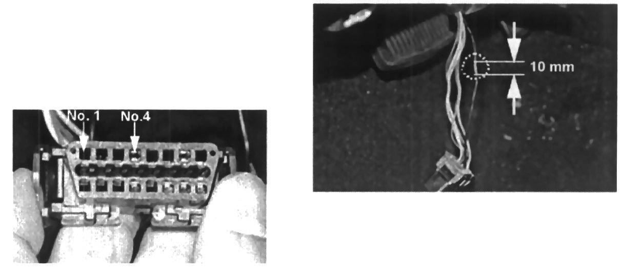 8. Locate the No. 4 terminal wire in the OBD connector. Strip about 10 mm (1/2 inch) from the No. 4 wire (black color) at a point 80 mm (about 3 inches) from the connector end.