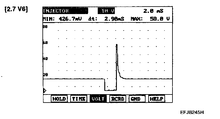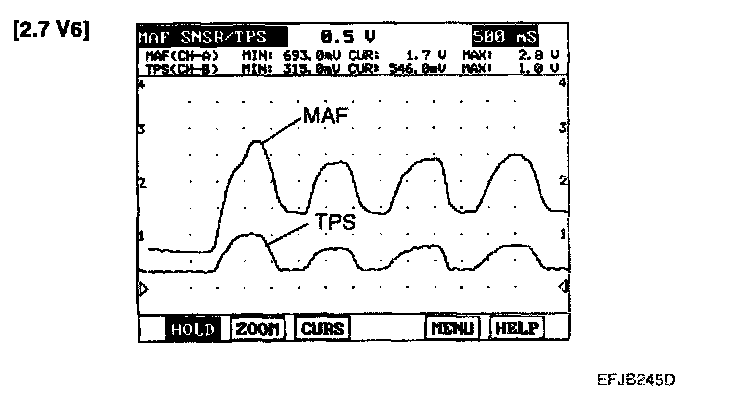 MAJOR SENSOR REFERENCE WAVE-FORMSThe following are the major sensor reference wave-forms. Below is the data for CMP, Mass Air Flow Sensor, Throttle Position Sensor, Rear O2 Sensor, Front O2 Sensor and Injection Pulse when rewing quickly up to 4800 rpm under no load after warming up engine sufficiently. Each value is for reference, the exact values may vary.