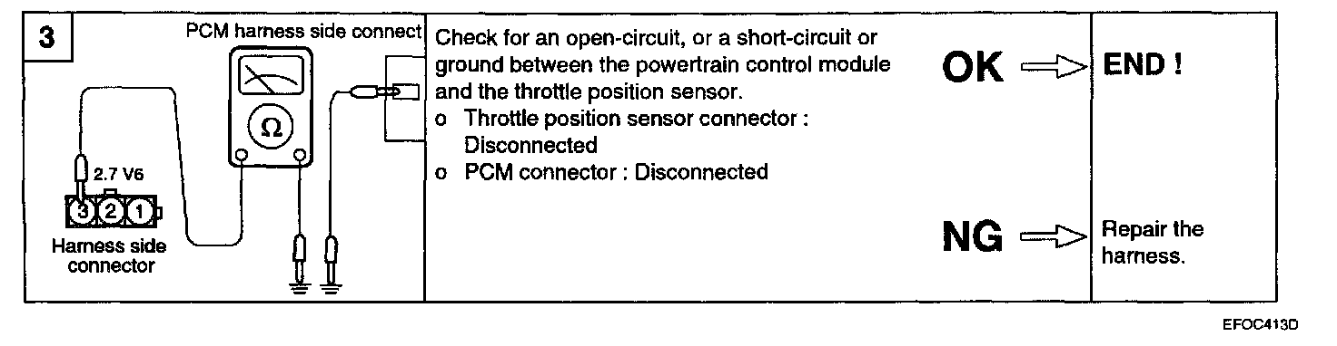 3. Connect a pointer type ohmmeter between terminal 2 (sensor ground) and terminal 3 (sensor output) for 2.7 V6.