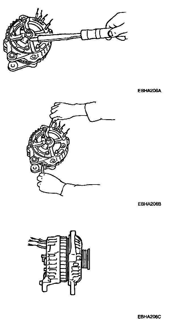 2. The rear cover may be hard to remove be cause a ring is used to lock the outer race of the rear bearing. To facilitate removal of rear cover, heat lust the bearing box with a 200-watt soldering iron. Do not use a heat gun as it may damage the diode assembly.