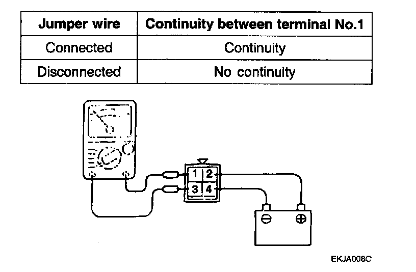 c. Check the continuity between terminal 1 and terminal 3 of the A/T control relay when the jumper wires are connected and disconnected from the battery.