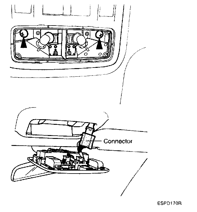 Loosen the 2 mounting screws, disconnect the connector, and then remove the overhead console.