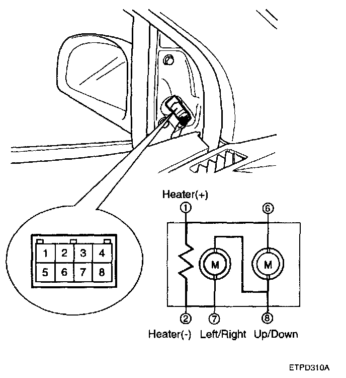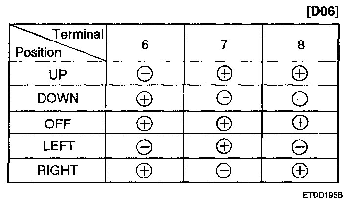 2. Apply battery voltage to each terminal as shown in the table and verify that the mirror operates properly.