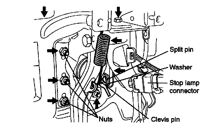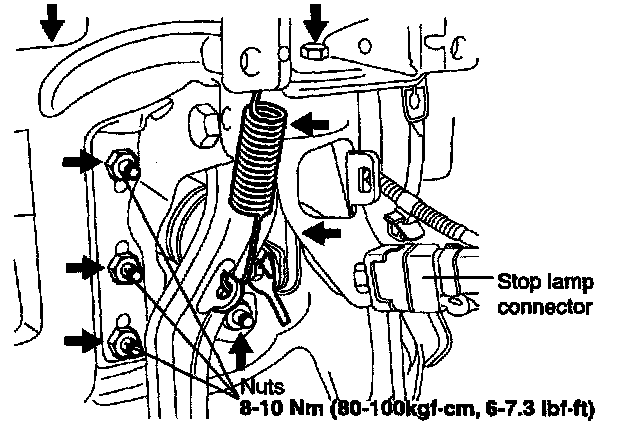 2. Install the brake pedal assembly and tighten the flange nuts (booster mounting nuts) and bolt.