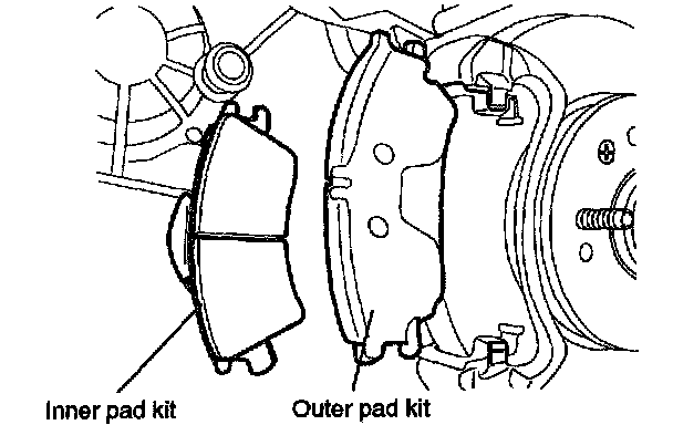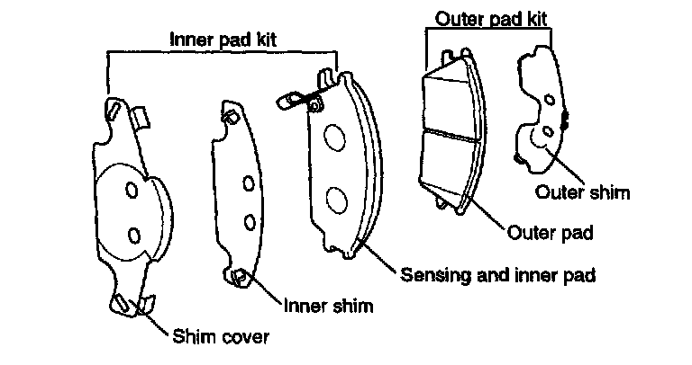 4. Install the new pads. The shims are attached to each pad as illustrated.