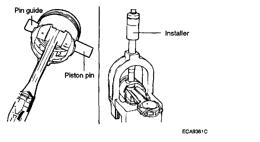 3. Check that the piston pin fits in the piston pin hole. Replace any piston and pin assembly that is defective. The piston pin must be smoothly pressed by hand into the pin hole (at room temperature).